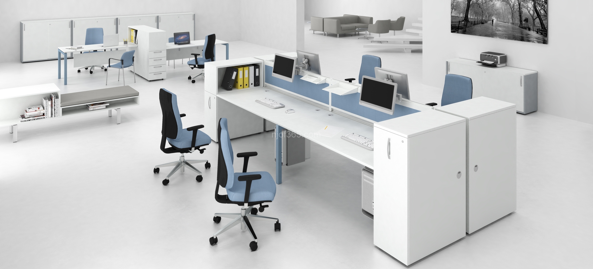 對(duì)比性的顏色選擇,即是將兩種或三種對(duì)比很明顯的顏色加以應(yīng)用,比如黑色和白色,白色和橘色,白色和藍(lán)色等的對(duì)比性色彩搭配選擇,這樣的色彩搭配非常的時(shí)尚,而且很醒目,適合現(xiàn)代辦公空間的風(fēng)格應(yīng)用。