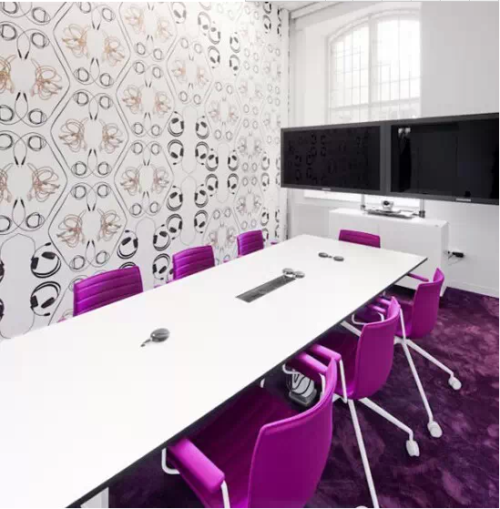 充滿繽紛的色彩和現(xiàn)代家具。在墻壁的白色背景下,用電線電纜、耳機(jī)等通訊設(shè)備制做了大型壁畫,充分