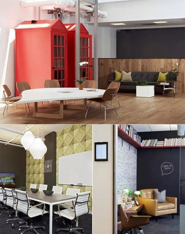 Foursquare是一個專為移動終端設(shè)計的基于位置的社交網(wǎng)絡(luò),它允許你標記當(dāng)前位置并在你曾經(jīng)去過的地方留下一個足跡。他們的辦公室地址位于紐約。這里由工作區(qū)和充滿創(chuàng)意的休息室組成。在辦公室休息區(qū)里,F(xiàn)oursquare公司甚至為員工準備了一個足球娛樂室、乒乓球桌和沙狐球等設(shè)施,用來緩解員工的工作壓力。看過這些,試問誰不想“入駐”這樣一個辦公室呢?