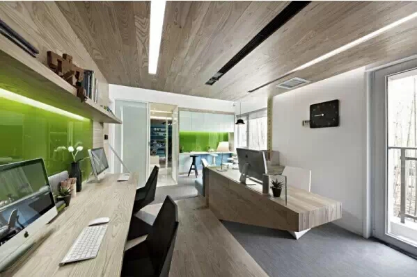 設(shè)計師在材料選擇上使用了木飾面、白色手掃漆、烤漆玻璃、木地板,辦公室設(shè)計色彩清新自然,很時尚的辦公空間規(guī)劃裝修。