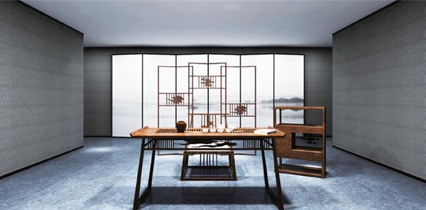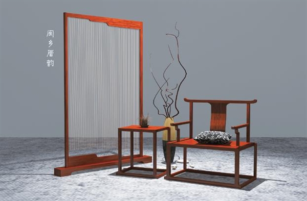經(jīng)營位置,在家具設(shè)計(jì)中,則是指各家具部件的質(zhì)、形、色、體積在家具中的關(guān)系處理。家具設(shè)計(jì)是否達(dá)到合理、舒適、美觀,關(guān)鍵是各關(guān)系的處理是否得當(dāng),也就是各自位置之間的經(jīng)營。根據(jù)家具整體的設(shè)計(jì)需要,安排各部件的面積、布局,體現(xiàn)賓主、呼應(yīng)、虛實(shí)、繁簡、疏密、藏露、參差等種種關(guān)系。中式家具設(shè)計(jì)作品《 閩鄉(xiāng)厝韻 》中的屏風(fēng)設(shè)計(jì)巧妙,設(shè)計(jì)師利用大面積的麻線作為屏風(fēng)的竹材之一,其質(zhì)地較軟,與屏風(fēng)簡潔的紅木框架形成明顯的軟硬對比、虛實(shí)對比、疏密對比、色彩對比,無疑為整個(gè)作品增加了不少亮點(diǎn)(圖1)。